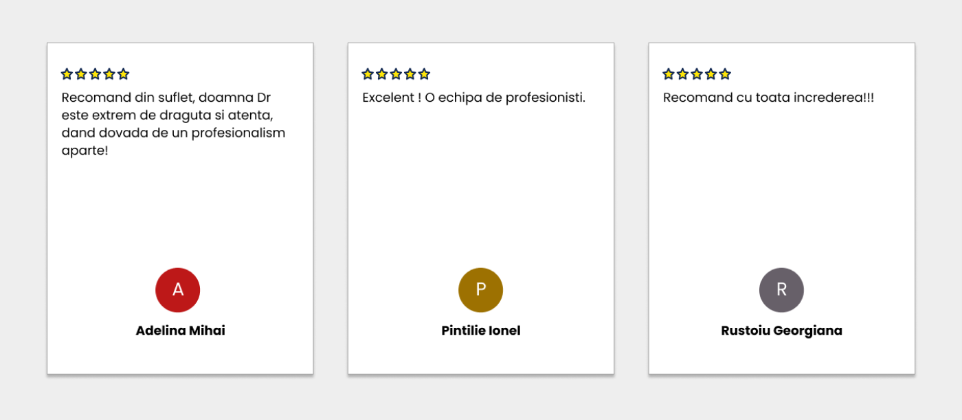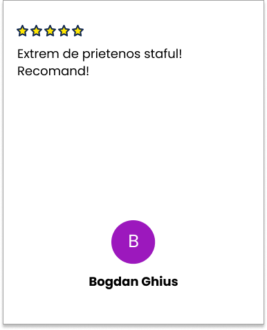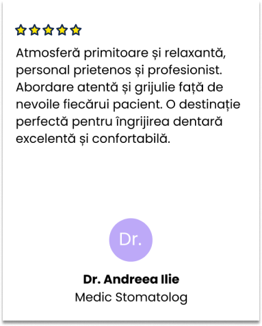 Descoperiți părerile reale ale pacienților noștri și cum experiența lor la Midart Dent a redat zâmbetele și încrederea în îngrijirea orală. O comunitate dedicată sănătății dumneavoastră, reflectată în cuvintele sincere ale celor care au ales să ne încredințeze zâmbetul lor.